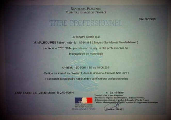 Il y a quelques années, j'ai entrepris de faire une formation qualifiante, j'ai donc fait mon inscription à un institut de formation (INFA), à Nogent-sur-Marne (94), pour suivre une formation de Web Designer - Infographiste (Diplôme d'État de niveau BAC+2), que j'ai obtenu.